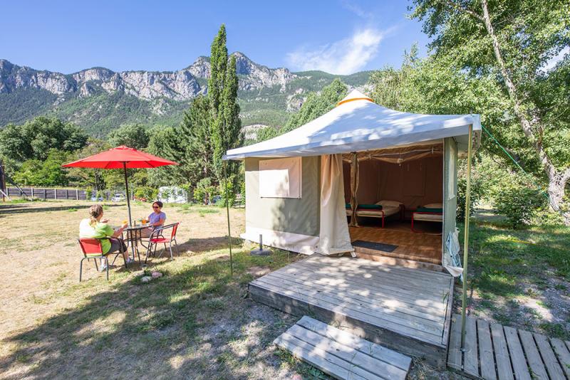 Découvrez nos Bengalis, tentes équipées (sans sanitaire) ! D'une superficie de 16m² avec deux chambres et une cuisine venez profiter de ces logements atypiques au coeur de notre camping 3 étoiles dans les Hautes Alpes. La partie extérieure est équipé d'un auvent avec table et chaises à disposition.